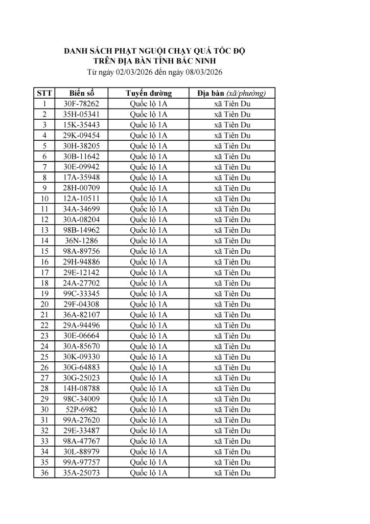 Bắc Ninh Danh sách 882 trường hợp dính phạt nguội tốc độ từ ngày 02/3 đến 08/3